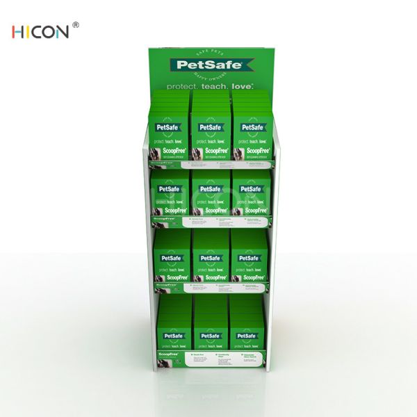 Our clients need the pet safe display rack that is associated with their brand, so we make the main color to be green, and cute cat photos to attract the customers. This display rack has 4 layers and the frame is made of stable metal that lets you can store enough pet products. Also, you can custom your own graphic on top sign, besides graphic and label strip on the front of each shelf.